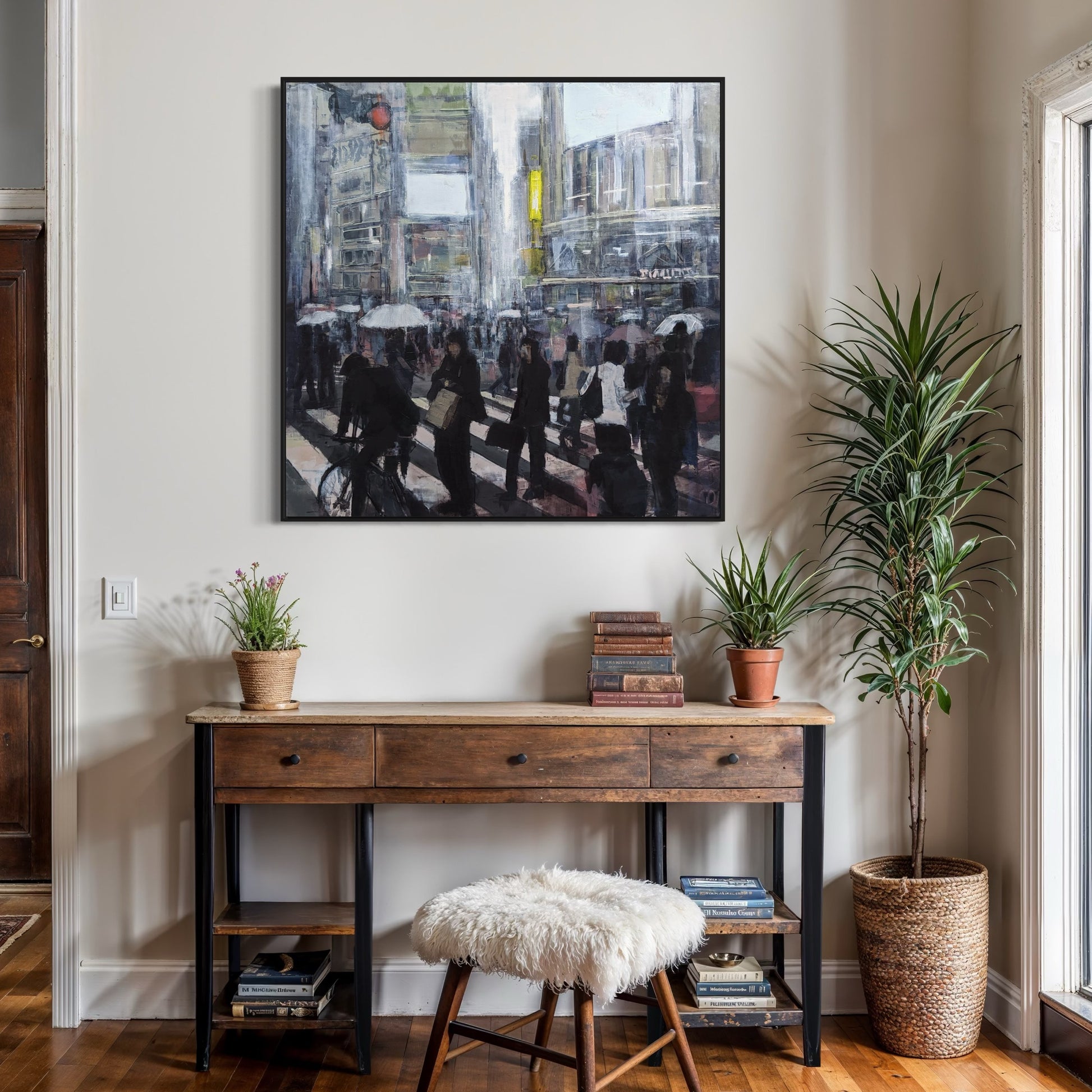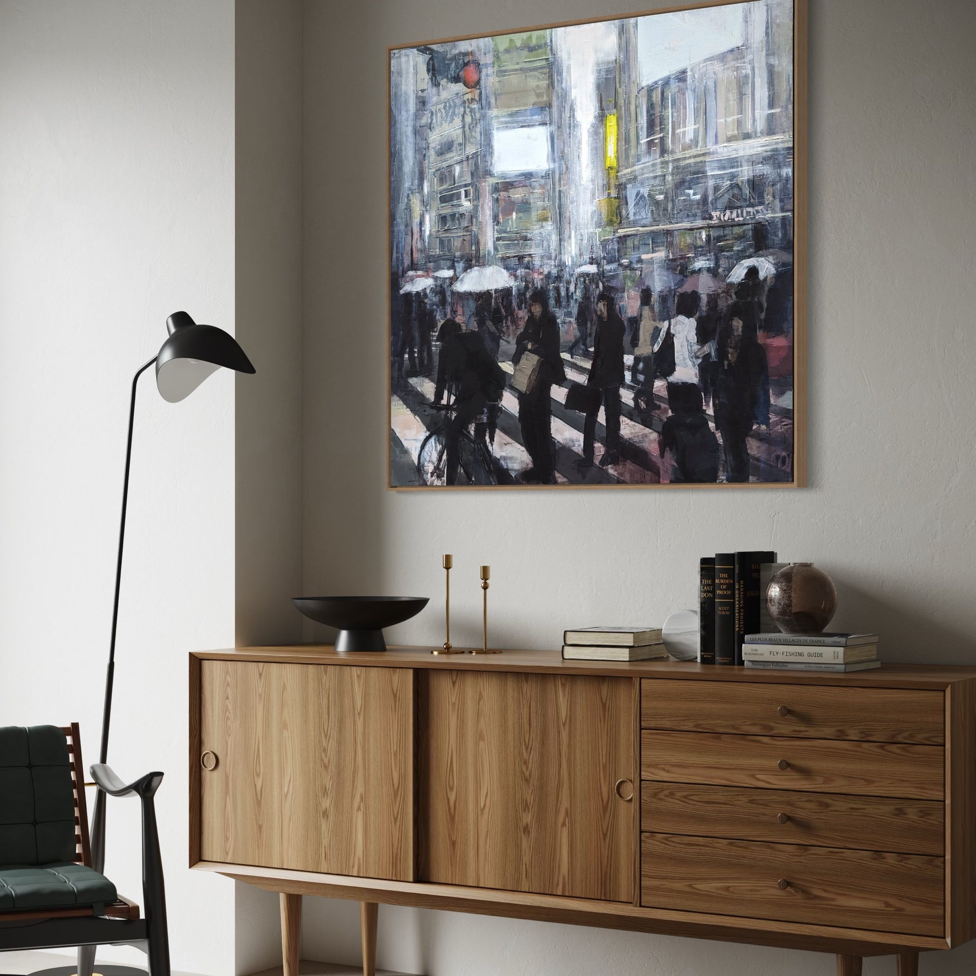 Die berühmte Kreuzung in Shibuya, Tokyo bei Regen. Als Referenz habe ich ein altes Video in schlechter Qualität, welches ich vor Jahren aufgenommen habe, verwendet. Die Ästhetik des Ausgangsmaterials hat mich inspiriert. Die Dichte an Menschen und Architektur lässt die Grenzen verschwimmen.